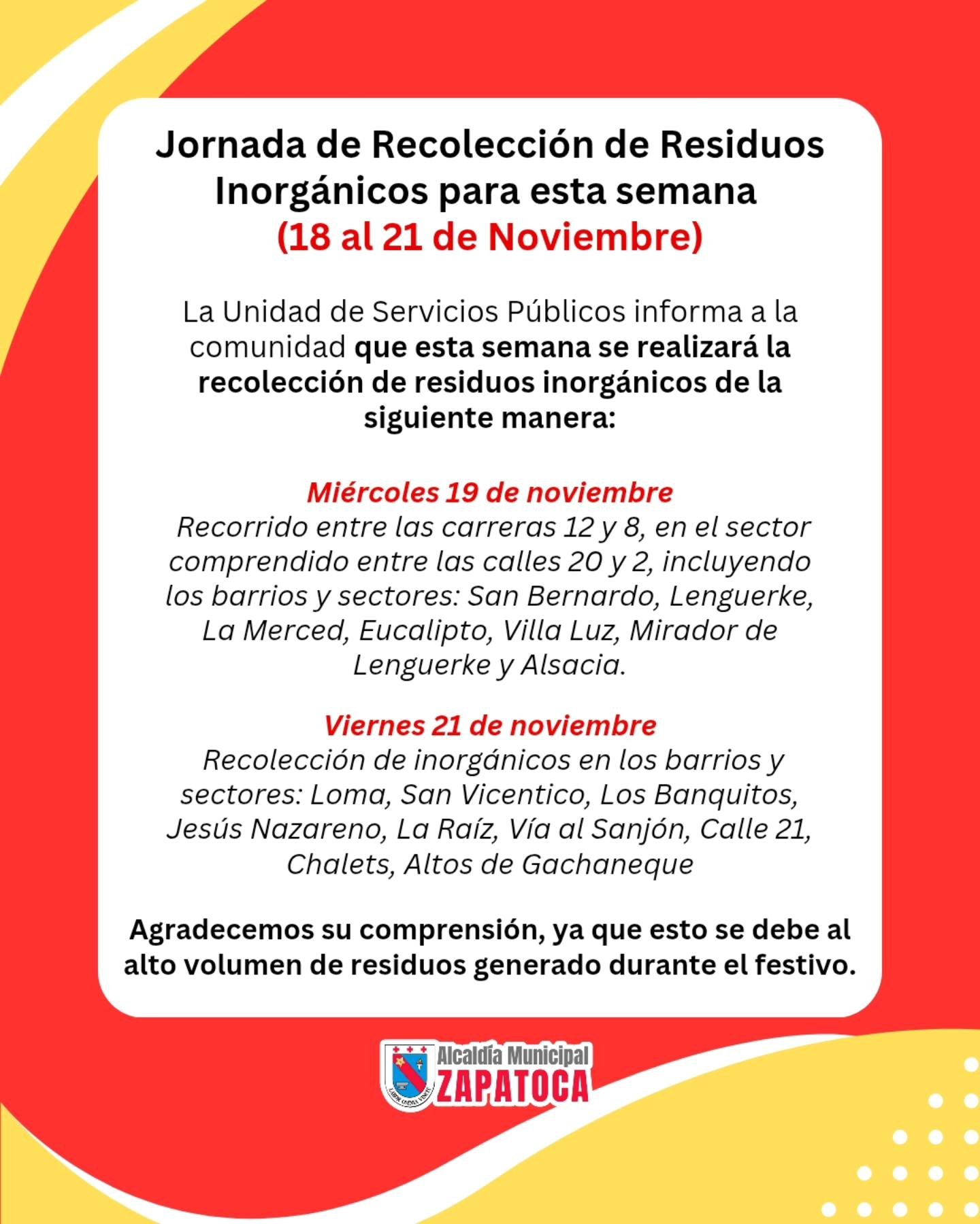 La Unidad de Servicios Públicos informa a la comunidad que, debido al alto volumen de residuos generados durante el festivo, esta semana la recolección de inorgánicos se realizará de manera especial en los siguientes sectores:
